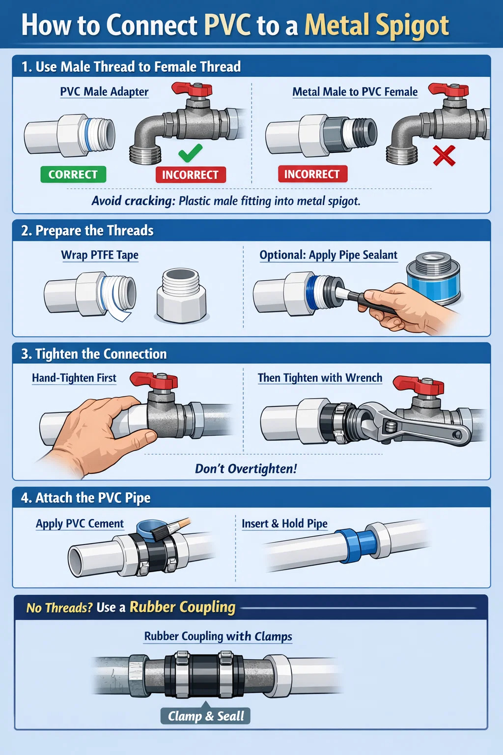 Dôvod: Ak sa to urobí opačne (kovový vonkajší závit naskrutkovaný do vnútorného závitu z PVC), kov je príliš tvrdý a dokonca aj mierne utiahnutie môže ľahko prasknúť plastový spoj, čo vedie k netesnostiam.