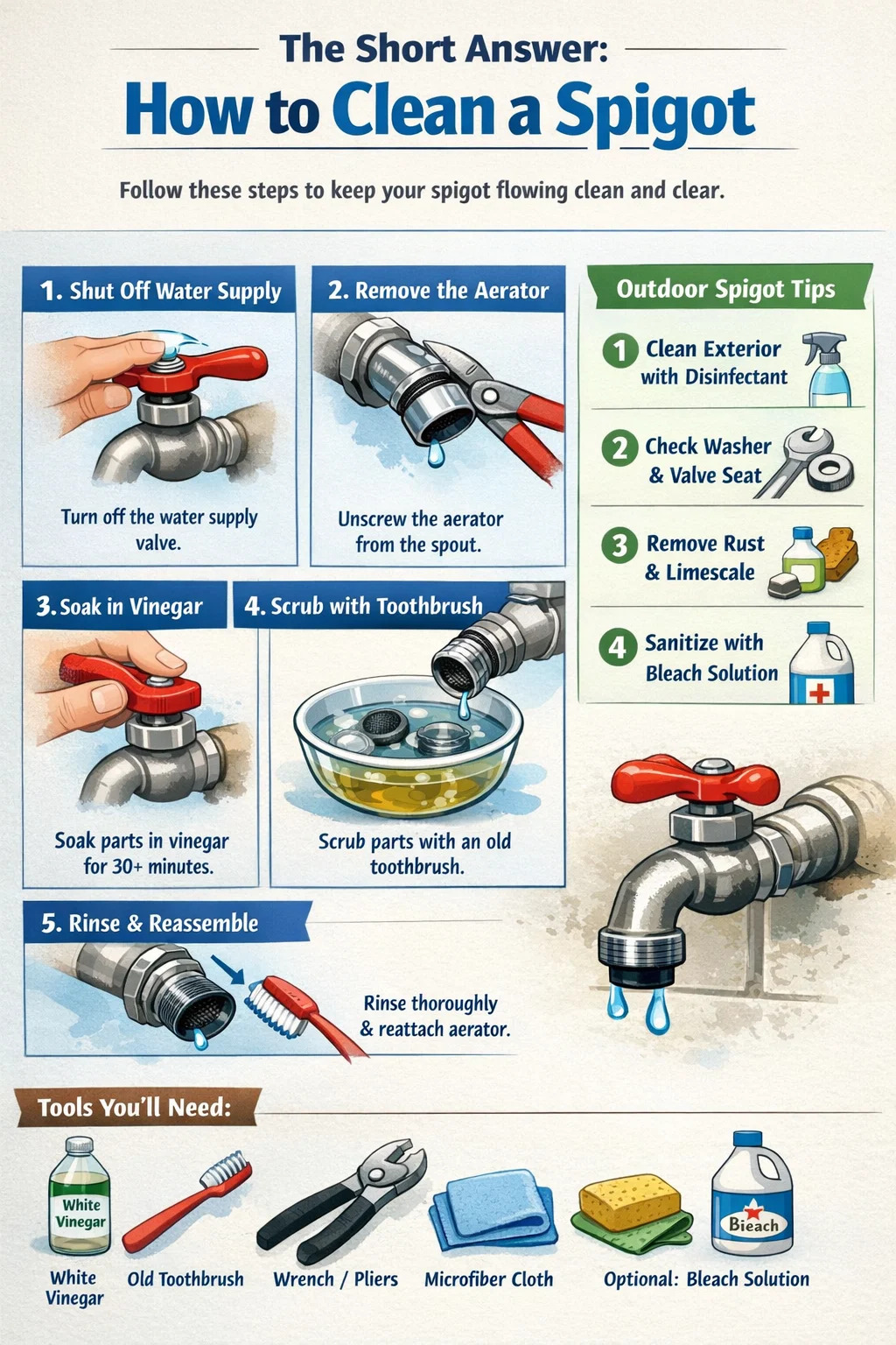 Na čistenie hrdla zatvorte prívod vody, rozoberte prevzdušňovač alebo hrot trysky, namočte diely do roztoku bieleho octu aspoň na 30 minút, aby sa rozpustili minerálne usadeniny, vydrhnite starou zubnou kefkou, dôkladne opláchnite a znova zložte. V prípade vonkajších kohútikov alebo záhradných kohútikov vystavených pôde, špine a poveternostným vplyvom budete tiež musieť utrieť vonkajšok dezinfekčným roztokom a skontrolovať podložku a sedlo ventilu, či nie sú nahromadené.