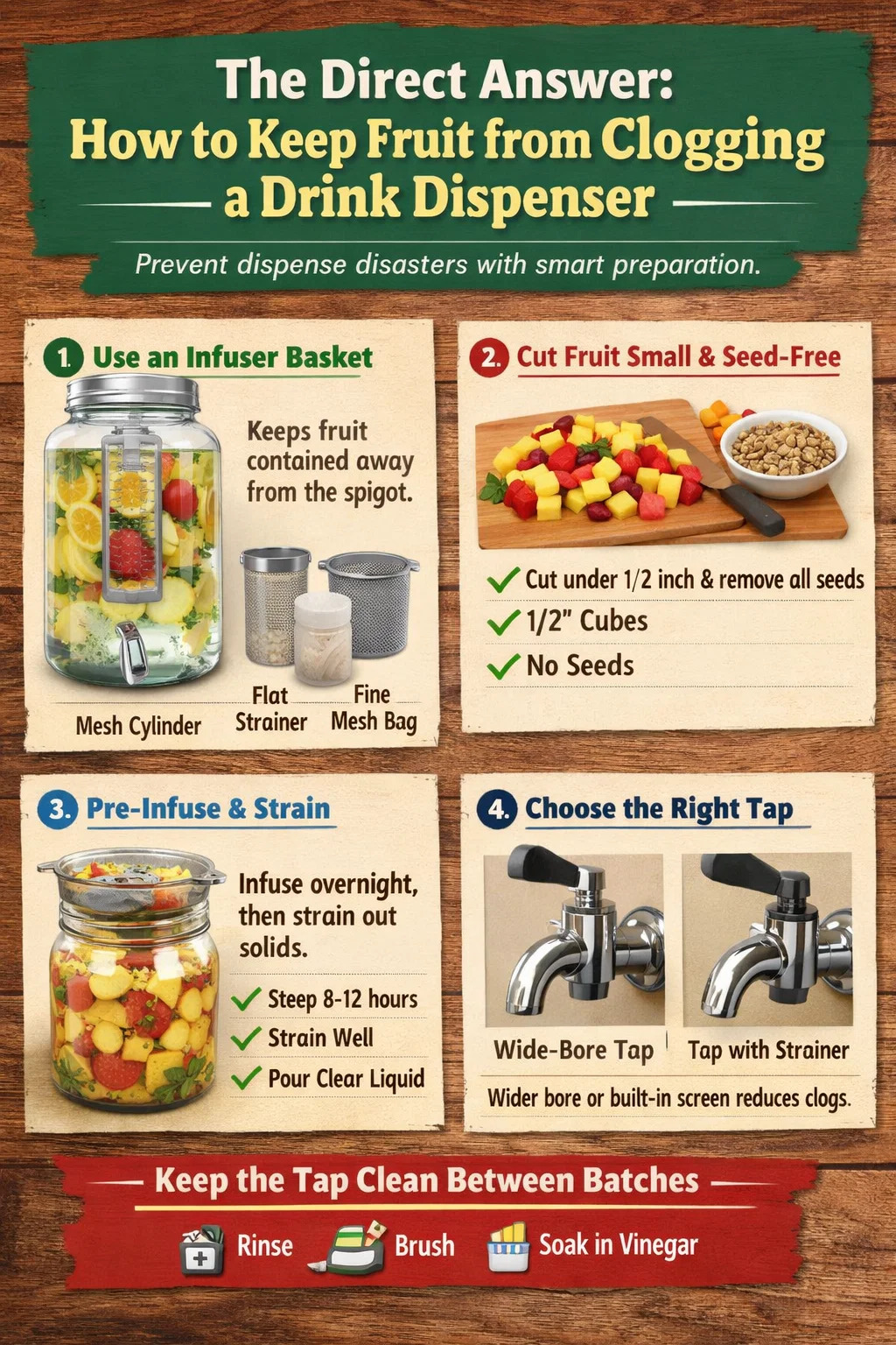 Jediným najspoľahlivejším riešením je udržiavať ovocie fyzicky oddelené od výčapného priestoru pomocou vylúhovacieho koša. Mnoho moderných dávkovačov nápojov sa dodáva s odnímateľným vylúhovacím valcom - sieťovinou alebo perforovanou trubicou, ktorá drží ovocie v strede alebo v hornej časti pohára. Kvapalina prechádza cez sieťku a zachytáva chuť, ale pevné kúsky sa nikdy nedostanú do kohútika.