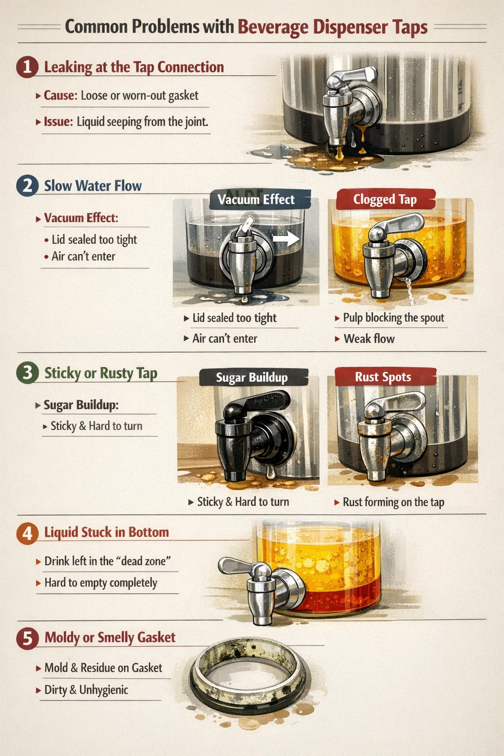 Pri používaní dávkovačov nápojov, hoci sa zdajú dizajnovo jednoduché, môžete naraziť na niektoré frustrujúce menšie problémy. To platí najmä pre základnú zložku - Kovový kohútik na dávkovanie nápojov – ktorý je najviac náchylný na problémy, ak nie je správne udržiavaný.