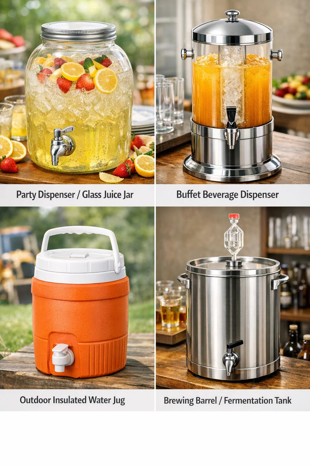 V našom každodennom živote majú tieto nádoby s malým kohútikom, kde sa ľudia zhromažďujú, aby dostali nápoje, niekoľko rôznych názvov v závislosti od ich vzhľadu a použitia. Ak hľadáte online alebo sa spýtate v obchode, pomocou nasledujúcich názvov získate ten správny výsledok: