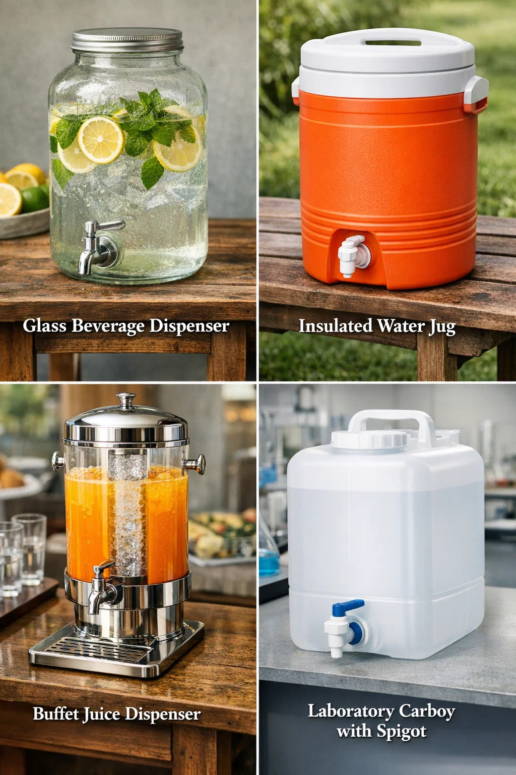Bežné používanie: Ľudia to zvyčajne nazývajú „sklený dávkovač nápojov“ alebo „dávkovač vody s kohútikom“. Keďže je priehľadný, vyzerá veľmi pekne s kockami ľadu, plátkami citróna alebo lístkami mäty vo vnútri.